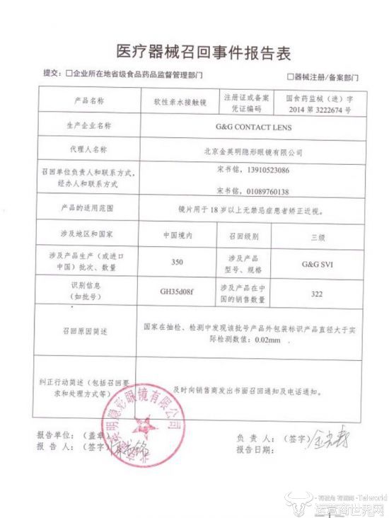 报告表显示,北京金英明隐形眼镜有限公司将即日起,立即召回此次涉及到G&G和SVI两款产品,总计322只,这些镜片用于18岁以上无禁忌症患者矫正近视。