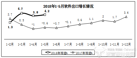 2018年6月,工信部发布2018年1-5月我国软件业实现出口208亿美元,较2017年1-5月软件业出口191.5亿美元相比增长4.2%。其中,外包服务出口增长6.1%,增速同比提高5.1个百分点;嵌入式系统软件出口增长2.7%,扭转去年同期负增长局面,增速同比提高4.5个百分点。