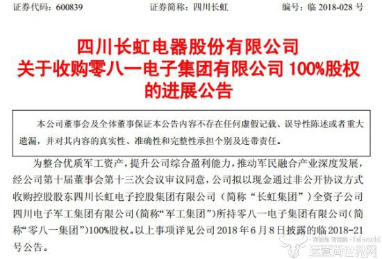 公告表示,四川长虹一旦将零八一电子集团整合进入上市公司,将有利于提升其综合盈利能力。从传出拟收购的消息到收购完毕,历时20天的收购行动到此终于告一段落。