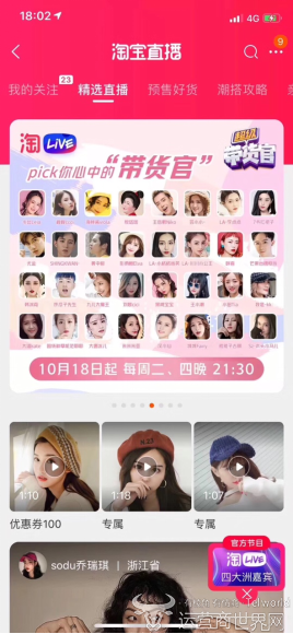 10月18日,淘宝直播联合阿里妈妈共同打造的国内首档带货红人养成直播综艺《超级带货官》正式上线。32位淘宝红人选手将携手天猫国际、益达、滋源、兰蔻、蒙牛、夏普、ALDI、戴森等7大品牌,通过1v1直播battle切磋“带货”功力。《奇葩说》辩手马薇薇、肖骁、范湉湉等“老奇葩”将到场助阵,亲身传递他们对时尚生活和优质消费的理念。