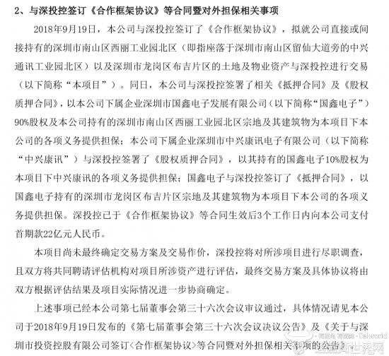 2018年9月19日,本公司与深投控签订了《合作框架协议》,拟就公司直接或间接持有的深圳市南山区西丽工业园北区(即指座落于深圳市南山区留仙大道旁的中兴通讯工业园北区)以及深圳市龙岗区布吉片区的土地及物业资产与深投控进行交易(以下简称“本项目”)。