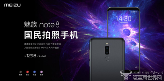 国民拍照手机」魅族 Note8,采用 6 英寸新一代全面屏,高通骁龙 632 移动平台强劲加持,1200 万+500 万像素人像双摄,沿袭魅族一贯的优秀拍照基因,再一次拓宽千元手机新边界。魅族 Note8 拥有曜黑、灰蓝、烟紫和焰红四种配色,全系配备 4+64GB 存储组合,售价为 1298 元,将于 11 月 1 日 0 点正式开售。