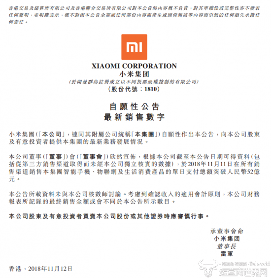 运营商世界网讯,11月12日小米集团发布了自愿性最新销售数字。11月11日,小米集团的所有渠道销售智能手机、物联网及生活消费产品的单日支付总额突破了52亿人民币。