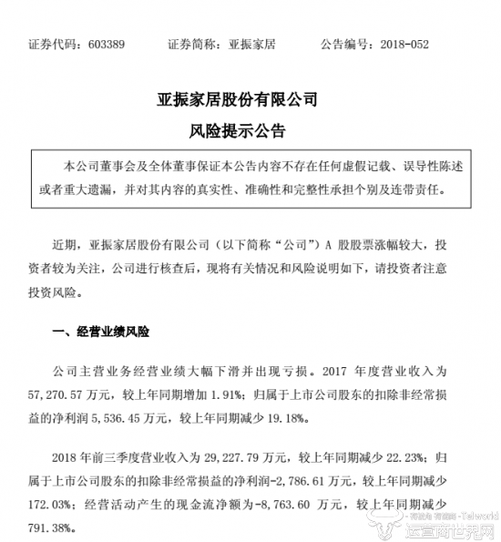 11月13日,亚振家居股份有限公司(以下简称”亚振家居“)发布了风险提示公告,因为A 股股票涨幅较大,对投资者发出了投资风险警告。