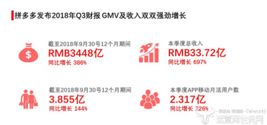 北京时间11月20日,拼多多发布Q3财报。报告显示,拼多多2018年第三季度再次强劲增长。在年度活跃买家数和活跃买家年度平均消费额大幅增长的双重驱动下,过去12个月,平台GMV达到3448亿人民币,同比增长386%。年度活跃买家数为3.855亿,较去年同期增长144%,比上季增加4200万。第三季度,拼多多移动端平均月活为2.317亿,较去年同期增长226%;比上季增加3700万。