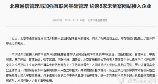 近日,北京通信管理局针对少数接入企业网站未备案的情况,约谈了8家相关违规企业。运营商世界网发现,号称中国目前规模最大的电信中立互联网基础设施服务提供商数据家也赫然在列。