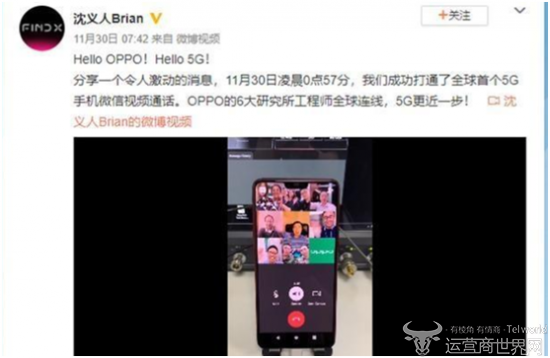 11月30日凌晨,OPPO中国大陆事业部总裁沈义人发布微博表示,OPPO已经成功打通全球首个5G手机微信视频通话。而此前有消息称,OPPO在研发上将投入100亿研发费用,其中很大一部分就是5G研发,主要就是为了在技术上抢得先机。