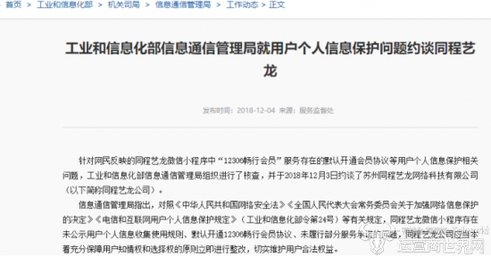 近日,工信部下发通知称,因网民反映同程艺龙微信小程序中“12306畅行会员”服务存在默认开通会员协议等用户个人信息保护相关问题,约谈了苏州同程艺龙网络科技有限公司。