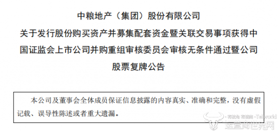 近日,中粮地产(集团)股份有限公司(以下简称为“中粮地产”)于2018年12月4日收到中国证券监督管理委员会(以下简称“中国证监会”)的通知,经中国证监会上市公司并购重组审核委员会于2018年12月4日召开的2018年第61次并购重组委工作会议审核,中粮地产本次发行股份购买资产并募集配套资金暨关联交易事项获得无条件通过。