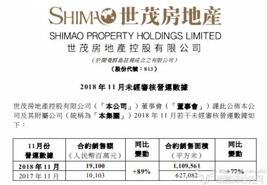 数据显示,世贸集团于2018年11月的合约销售额约为人民币191亿元(2017年11月为人民币101亿元),合约销售面积为110.96万平方米(2017年11月为62.71万平方米),较去年同期分别上升89%及77%。2018年11月平均销售价格为每平方米人民币17214元。