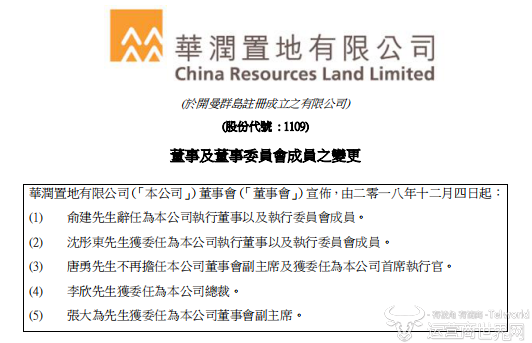 近日,华润置地有限公司(以下简称为“华润置地”)董事会宣布,由2018年12月4日起,俞建辞任为华润置地执行董事以及执行委员会成员。
