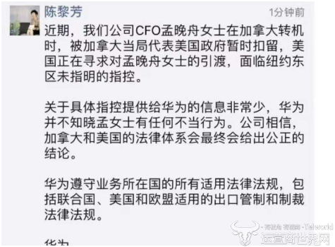 陈黎芳表示,近期,我们公司CFO孟晚舟女士在加拿大转机时,被加拿大当局代表美国政府暂时扣留,美国正在寻求对孟晚舟的引渡,面临纽约东区未指明的指控。