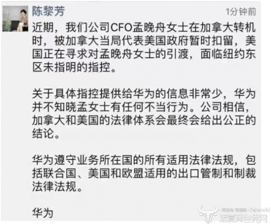 目前,华为董事、公共及政府事务部总裁陈黎芳,疑似华为轮值董事长郭平等众多高层一致回应称:华为遵守业务所在国的所有适用法律法规,包括联合国、美国和欧盟的出口管制和制裁法律法规,目前关于具体的指控非常少,华为方孟晚舟并无任何不当行为。