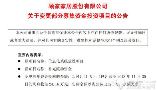 根据公告可以看出,顾家家居本次拟变更的募投项目为“信息化系统建设项目”,在此项目中拟投入总金额6977万,截至本公告日本项目已投入4084万。为了提高募集资金使用效率,顾家家居拟将该项目尚未投入的2917万募集资金全部补充为流动资金。