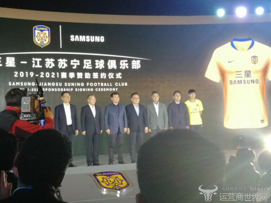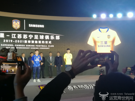 近日,“三星-江苏苏宁足球俱乐部2019-2021年赞助签约仪式”在江苏南京举行。随着签约活动到了尾声,双方还共同为大家展示了江苏苏宁足球俱乐部2019新赛季的球衣,江苏苏宁易购队球员代表周云、黄紫昌上台。