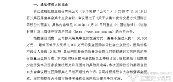 近日浙江红蜻蜓鞋业股份有限公司发布关于回购公司股份通知债权人的公告。