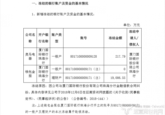 公告显示,由于奥马电器与厦门国际银行股份有限公司珠海分行金融借款合同纠纷,原告向珠海中院申请提出财产保全的申请,请求对被告奥马电器以及钱包金服价值人民币1.2亿元的财产采取保全措施。依据原告的财产保全申请,珠海中院对公司及钱包金服的银行账户进行了冻结,同时对公司所持的奥马冰箱100%的股份进行了司法冻结。
