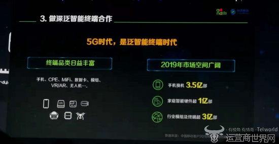 简勤表示,终端品类日益丰富,手机、CPE、MiFi、数据卡、模组等等都是市面上常见的终端类型。目前来看,2019年市场空间也将更加广阔,手机换机数量将达3.5亿部、家庭智能硬件将超1亿部、行业模组及终端超3亿部。