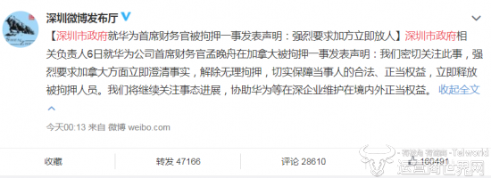 2018年0点13分深圳市政府通过官方微博@深圳微博发布厅表态:强烈要求加方立即放人。