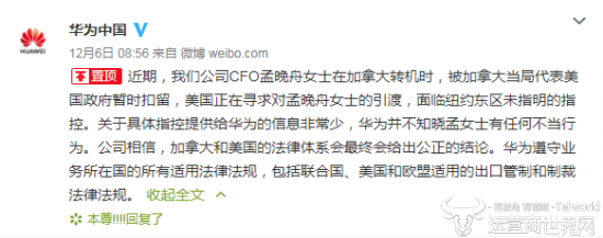 对此华为第一时间表态:公司CFO孟晚舟女士在加拿大转机时,被加拿大当局代表美国政府暂时扣留。并表示孟晚舟没有任何不当行为。