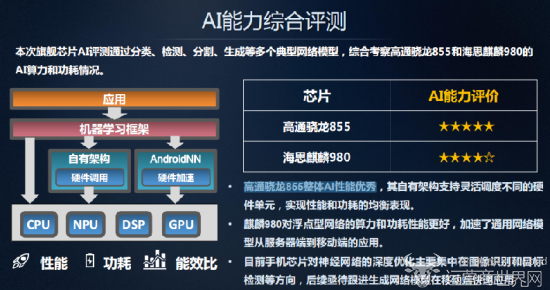 而此次的旗舰芯片AI评测,则是通过分类、检测、分割、生成等多个典型网络模型,综合考察高通骁龙855和海思麒麟980的AI算力和功耗情况。评测发现,高通骁龙855整体AI性能较为优秀。