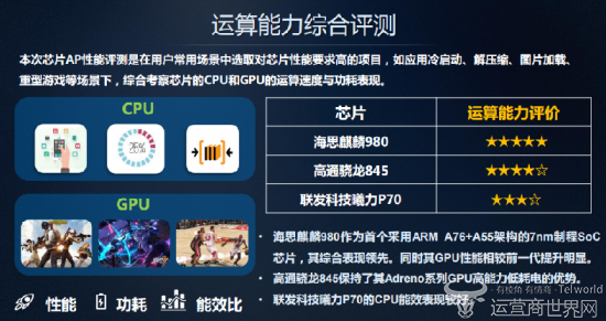 从运算能力方面来看,此次芯片AP性能评测是在用户常用场景中选取对芯片性能要求高的项目,如应用冷启动、解压缩、图片加载、重型游戏等场景下,综合考察芯片的CPU和GPU的运算速度与功耗表现。