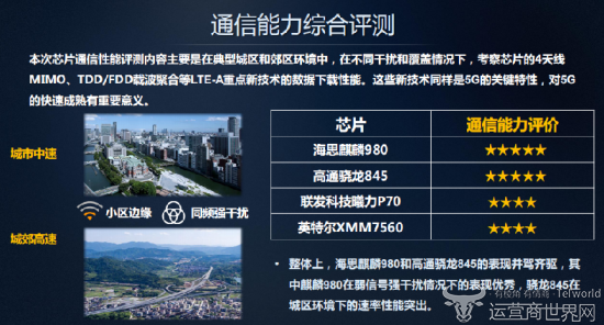 其中,此次芯片通信性能评测内容主要是在典型城区和郊区环境中,在不同干扰和覆盖情况下,考察芯片的4天线MIMO、TDD/FDD载波聚合等LTE-A重点新技术的数据下载性能。这些新技术同样是5G的关键特性,对5G的快速成熟有重要意义。