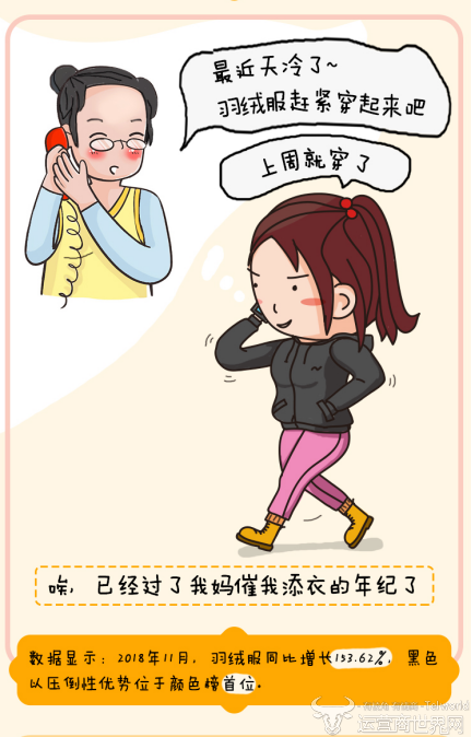 “一个月前就已经穿羽绒服了。”与以前需要父母催促添衣相比,90后普遍懂事了不少。数据显示,2018年11月,苏宁平台羽绒服同比增长153.62%,黑色以压倒性优势位于颜色榜首位,耐脏成为主要原因。