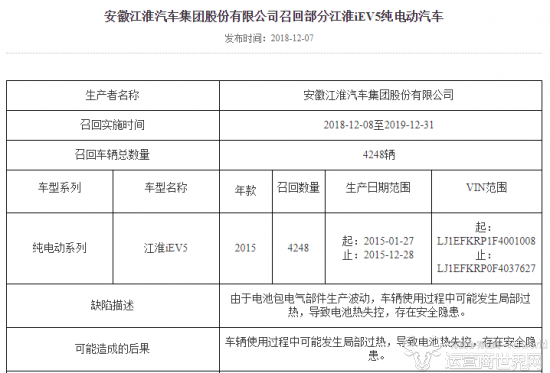 日前,安徽江淮汽车集团股份有限公司(以下简称为“江淮汽车”)向国家市场监督管理总局备案了召回计划,决定自2018年12月8日起,召回2015年1月27日至2015年12月28日生产的部分江淮iEV5纯电动汽车,共计4248辆。