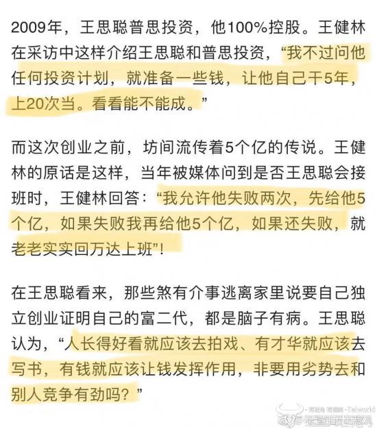 当然这段采访里还有很多亮点,比如王健林当年说让王思聪自己创业,给他两次机会,一次机会是五个亿。