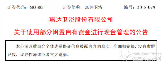 日前,惠达卫浴股份有限公司(以下简称“惠达卫浴”)发布了关于使用部分闲置自有资金进行现金管理的公告。
