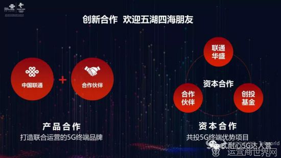 5G时代,中国联通面向产业链开放两个层面的深度合作:“5G终端联合品牌合作”和“5G资本层面合作”。产品层面上,联通将与产业链合作伙伴打造联合运营的5G终端共享联合品牌,中国联通为创新产品和创业公司提供品牌背书,做大做响联合品牌;资本层面上,中国联通是国家首批混改国企,混改将逐步深化到二级单位和业务板块。资本层面对于5G终端好的项目将联合创投基金公司、项目公司开展资本层面合作,共赢5G!