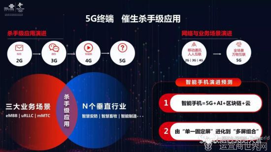 我们现在说的杀手级应用,诸如微博、微信、短视频,这些都是在个人移动通信的领域里讲的。由于5G本身就是三个场景、N个垂直行业,所以5G时代,杀手级应用将显现在三大场景N个垂直行业,5G终端出来后,杀手级应用将应运而生。