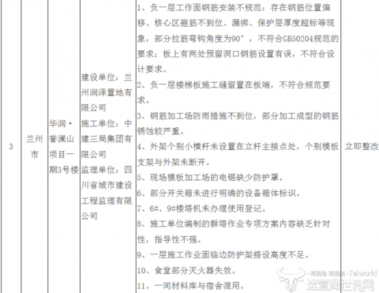据了解,华润置地出现问题的项目是位于兰州市区的华润·誉澜山项目一期3号楼,建设单位是兰州润泽置地有限公司,施工单位是中建三局集团有限公司,监理单位是四川省城市建设工程监理有限公司。其中,润泽置地是华润置地二级子公司。