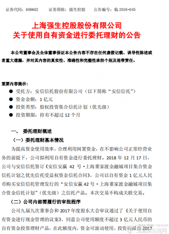 公告显示,2018 年12月17日,强生与安信信托签订《安信安赢 42 号·上海董家渡金融城项目集合资金信托计划之优先信托受益权资金信托合同》,强生以自有资金1亿元人民币购买安信信托管理发行的“安信安赢 42 号·上海董家渡金融城项目集合资金信托计划”(优先级)之信托产品。