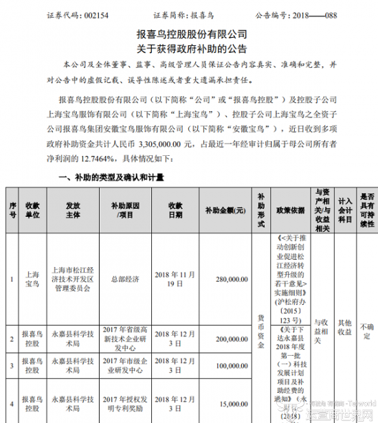 值得注意的是,报喜鸟称本次补助占最近一年经审计归属于母公司所有者净利润的12.7464%。