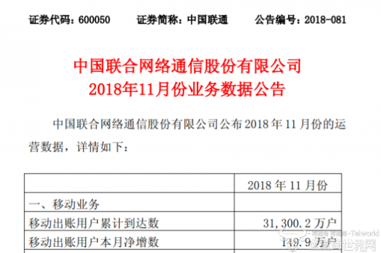 公告显示,中国联通移动用户累计到达数为3.13亿户,11月净增数为149.9万户。固网宽带方面,用户累计到达数8110.1万户,固网宽带用户本月净增数44.4万户;本地电话用户累计到达数5629.7万户,本地电话用户本月净减少17.4万户。