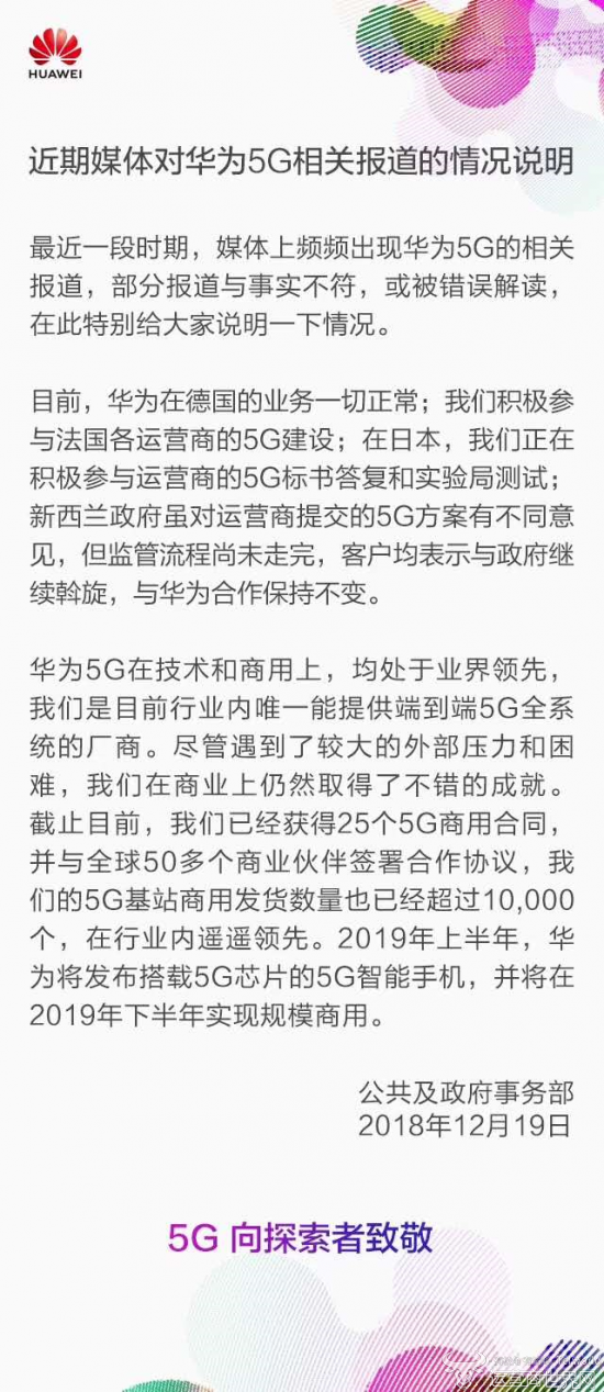 华为透露:“目前,华为在德国的业务一切正常,我们积极参与法国各运营商的5G建设;在日本,我们正在积极参与运营商的5G标书答复和实验局测试;新西兰政府虽对运营商提交的5G方案有不同意见,但监管流程尚未走完,客户均表示与政府继续斡旋,与华为合作保持不变。”