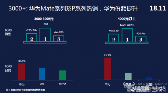 在整个报告中,有一个点引起了运营商世界网的注意。那就是在4000元以上的机型价位段上,华为包揽了前三名,产品机型分别为华为Mate 20 Pro、华为Mate 20以及华为P20 Pro。