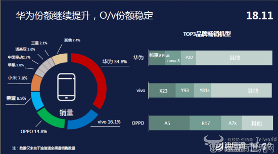 近期,迪信通发布了11月份月报。毫无悬念的,华为、OPPO、vivo占据了榜单前三名。其中,华为的市场销量更是从十月的33.4%提升到了34.8%。看来,手机圈老大哥的名号真不是白叫的。