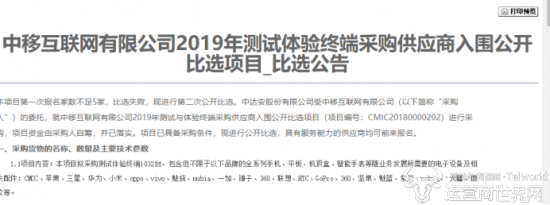 日前,中移互联网公司宣布将对2019年测试体验终端采购供应商进行公开比选,拟选取2家采购终端1032台,预算高达450万元,不得不说无论是哪家获得就将是笔大单。