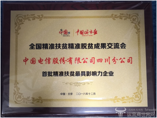 中国电信四川公司荣获全国“首批精准扶贫最具影响力企业”荣誉称号,这是通信行业唯一获此殊荣的企业,也是四川唯一获此殊荣的企业。