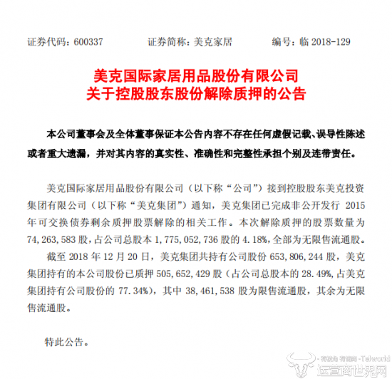 截至2018年12月20日,美克集团共持有美克家居股份6.54亿股,其中已质押5.05亿股(占总股本的28.49%,占其持有美克家居股份的77.34%),其中3846万股为限售流通股,其余为无限售流通股。