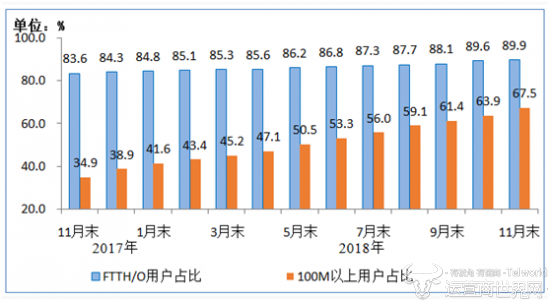 图4 2017年11月末-2018年11月末光纤接入(FTTH/O)和100Mbps及以上接入速率的固定互联网宽带接入用户占比情况