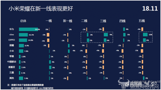除了从区域方面看,在线级方面,华为和OPPO、vivo则呈现十分明显的不同。11月份,华为在四线城市表现不错,而OPPO、vivo在二线、三线甚至五线城市表现十分亮眼。