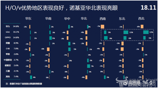 据数据显示,华为主要在华南、华中和华北地区销量表现很好,数据呈现净增长;但是华东、西南、东北以及西北地区在11月份表现差强人意。