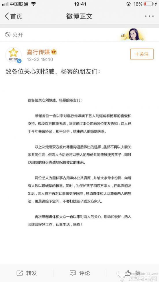 运营商世界网讯 12月22日,嘉行传媒宣布:杨幂刘恺威已于今年签署协议,和平分手,结束婚姻关系。
