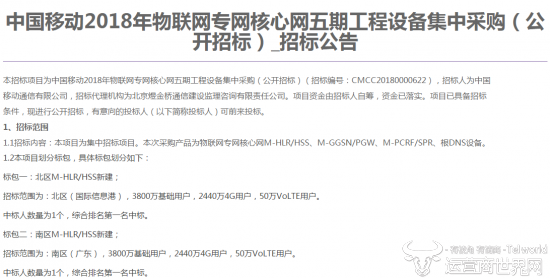 招标范围为:南区(广东),3800万基础用户,2440万4G用户,50万VoLTE用户;