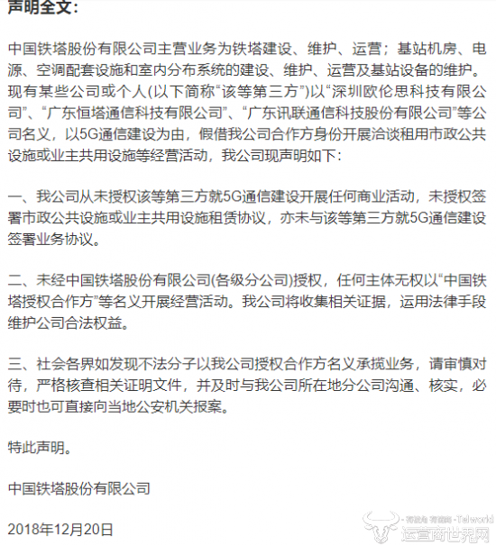 近日,中国铁塔对外发表声明,称有公司以“深圳欧伦思科技有限公司”等公司名义,假借中国铁塔合作方身份开展经营活动。对此,中国铁塔将动用法律手段维护公司合法权益。