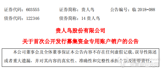 近日,贵人鸟股份有限公司(以下简称为“贵人鸟”)发布了关于其首次公开发行募集资金专用账户销户的公告。